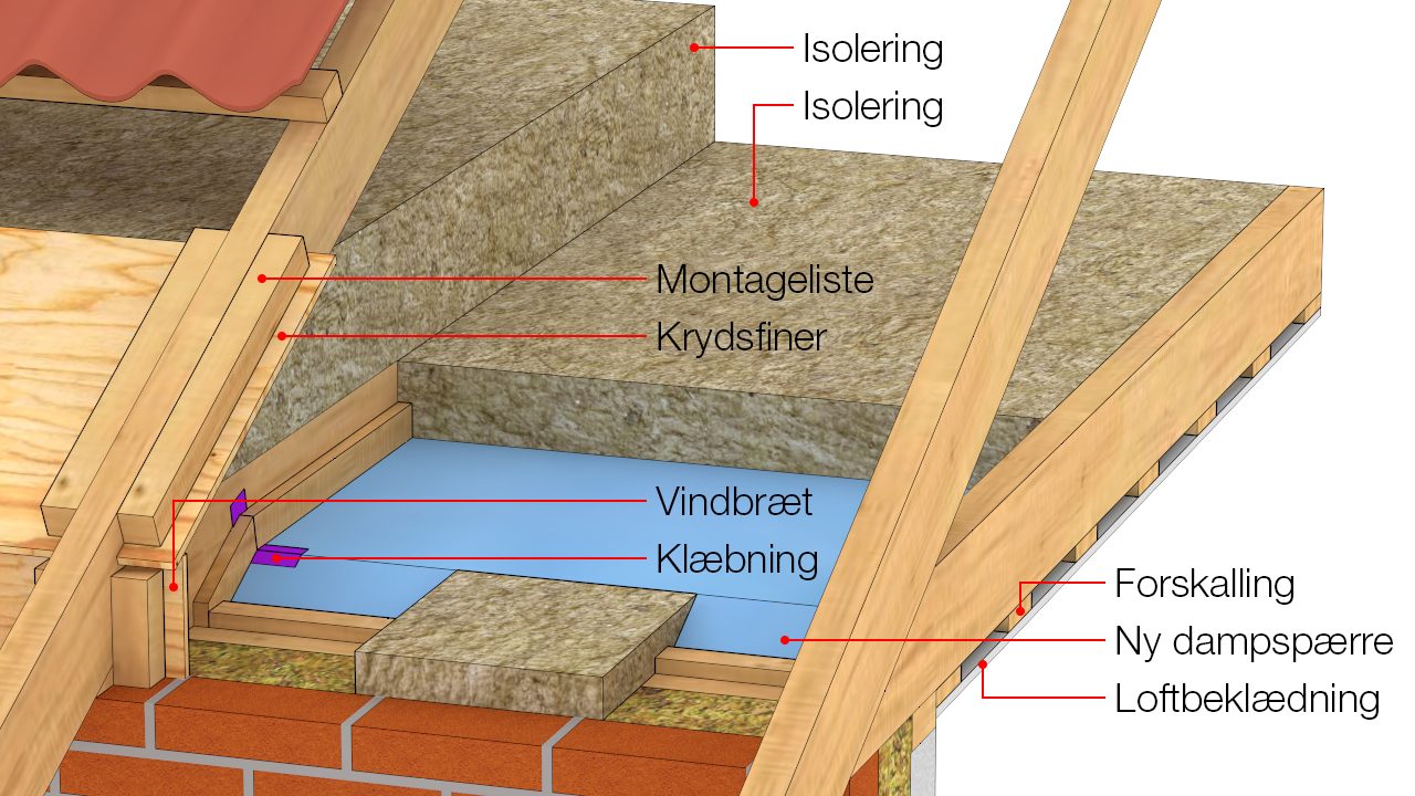 Efterisolering af loft – dampspærre monteret oppefra