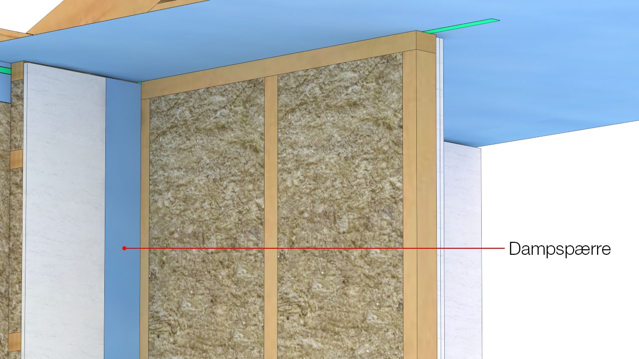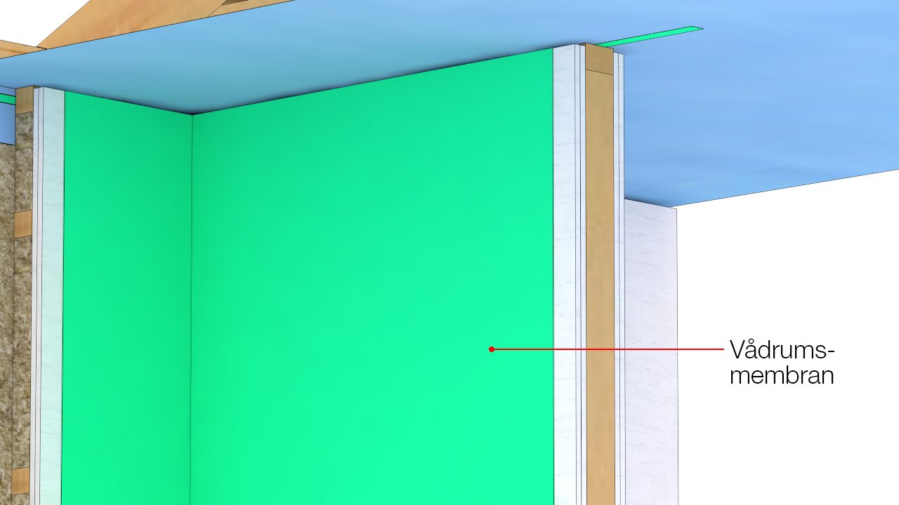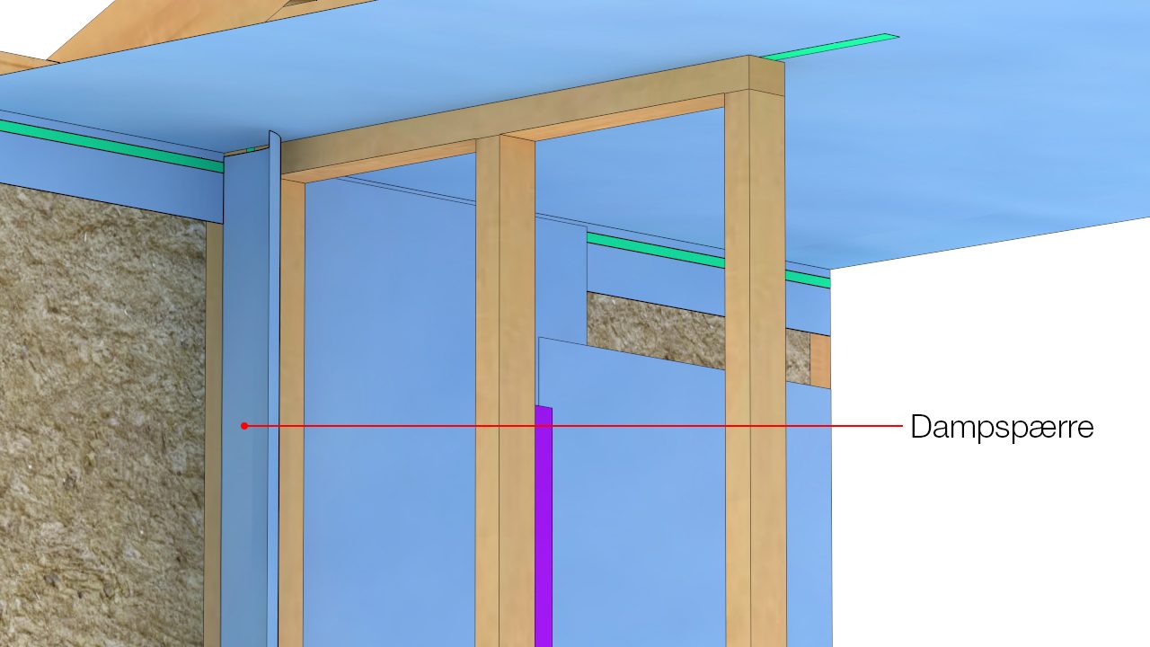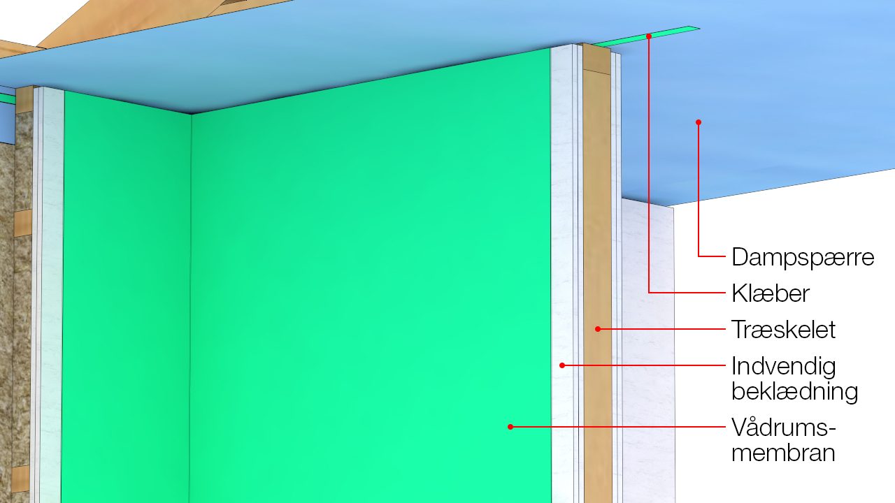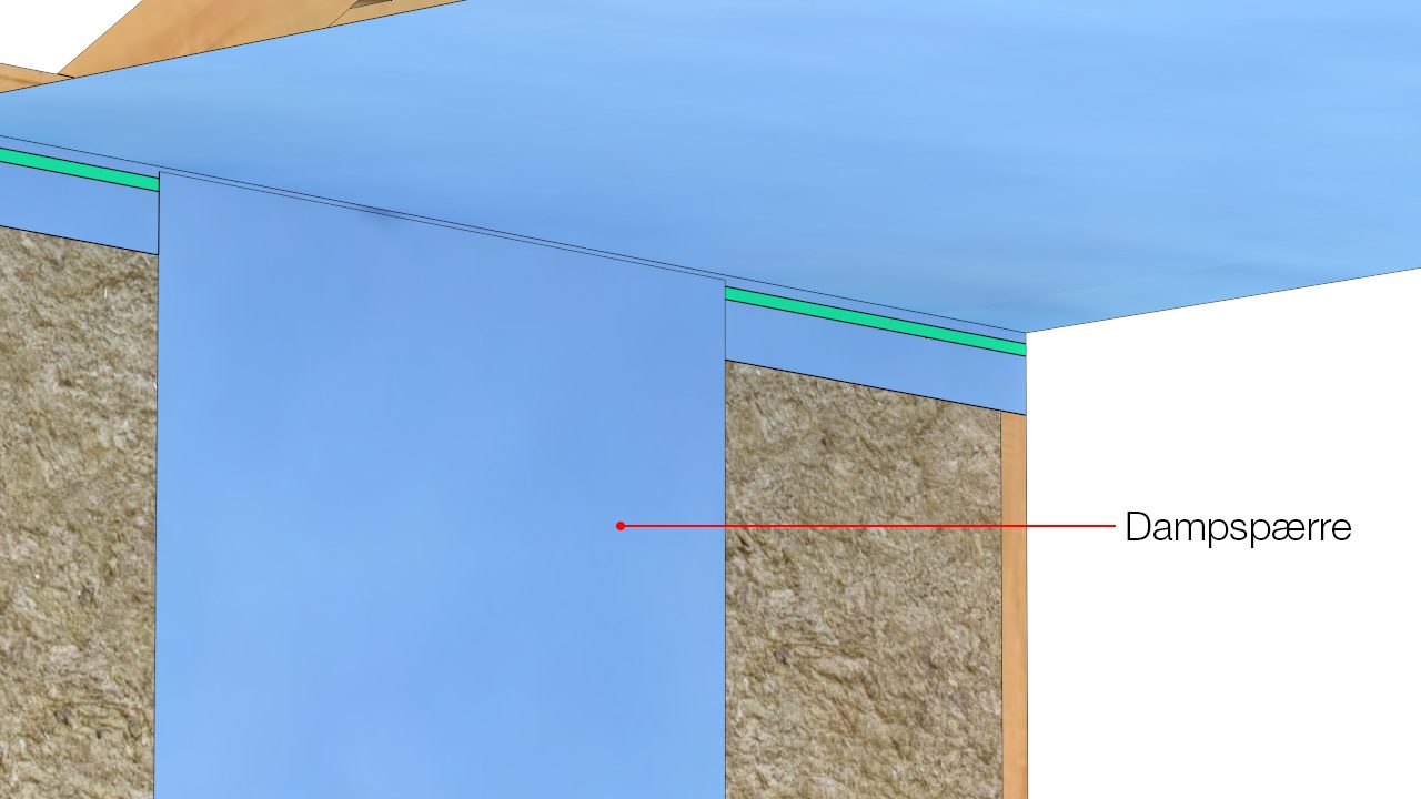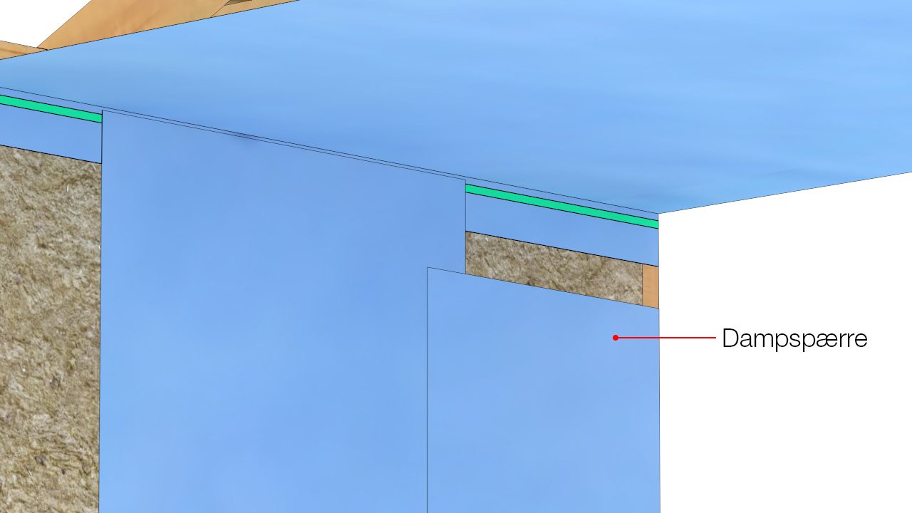 Overgang mellem dampspærre i loft og vådrumsmembran i væg