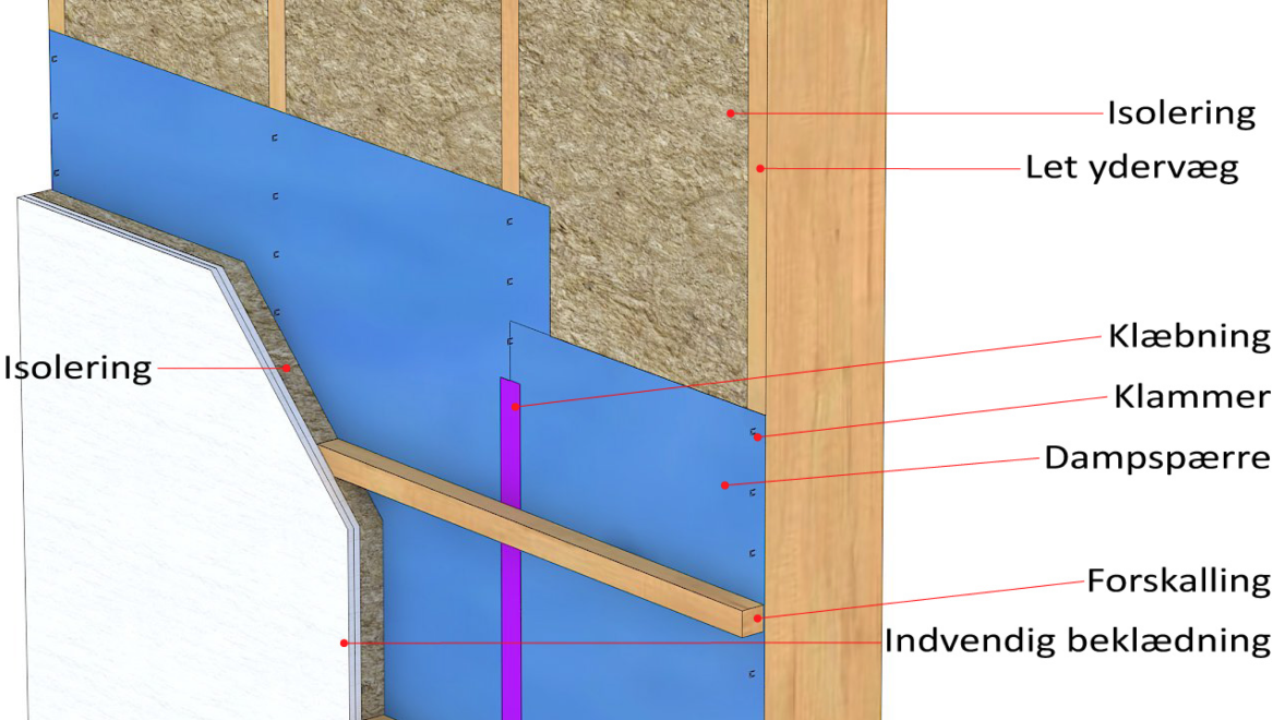 Principskitse af efterisolering udført med forsatsvæg